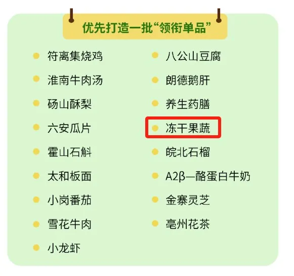 日前,安徽省政府辦公廳印發(fā)了《皖北綠色食品產(chǎn)業(yè)集群建設(shè)實施方案》。方案提出,發(fā)揮皖北空間、資源、市場優(yōu)勢,堅持種養(yǎng)一塊抓、糧肉一塊抓、頭尾一塊抓,做好“糧頭食尾”“畜頭肉尾”“農(nóng)頭工尾”增值大文章。高起點打造綠色食品的新產(chǎn)業(yè)、新技術(shù)、新模式、新業(yè)態(tài),構(gòu)建全新產(chǎn)業(yè)生態(tài),加快建設(shè)結(jié)構(gòu)合理、鏈條完整、布局優(yōu)化、規(guī)模巨大的皖北綠色食品產(chǎn)業(yè)集群,推進(jìn)長三角綠色農(nóng)產(chǎn)品生產(chǎn)加工供應(yīng)基地高質(zhì)量發(fā)展。其中,方案明確要優(yōu)先打造一批“領(lǐng)銜單品”,其中凍干果蔬在列。