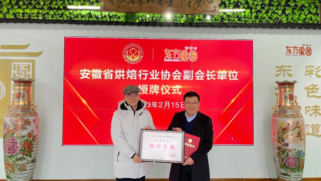 2023年2月15日安徽省烘培協(xié)會(huì)高文光秘書長(zhǎng)一行蒞臨東方果園考察調(diào)研,為東方果園“安徽省烘培協(xié)會(huì)副會(huì)長(zhǎng)單位”“安徽烘培榜樣企業(yè)”授牌。企業(yè)負(fù)責(zé)人張仲君等相關(guān)領(lǐng)導(dǎo)參與接待。
