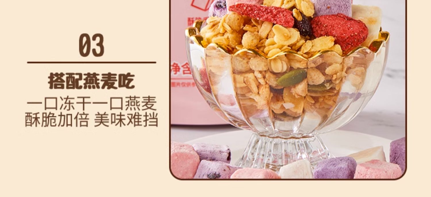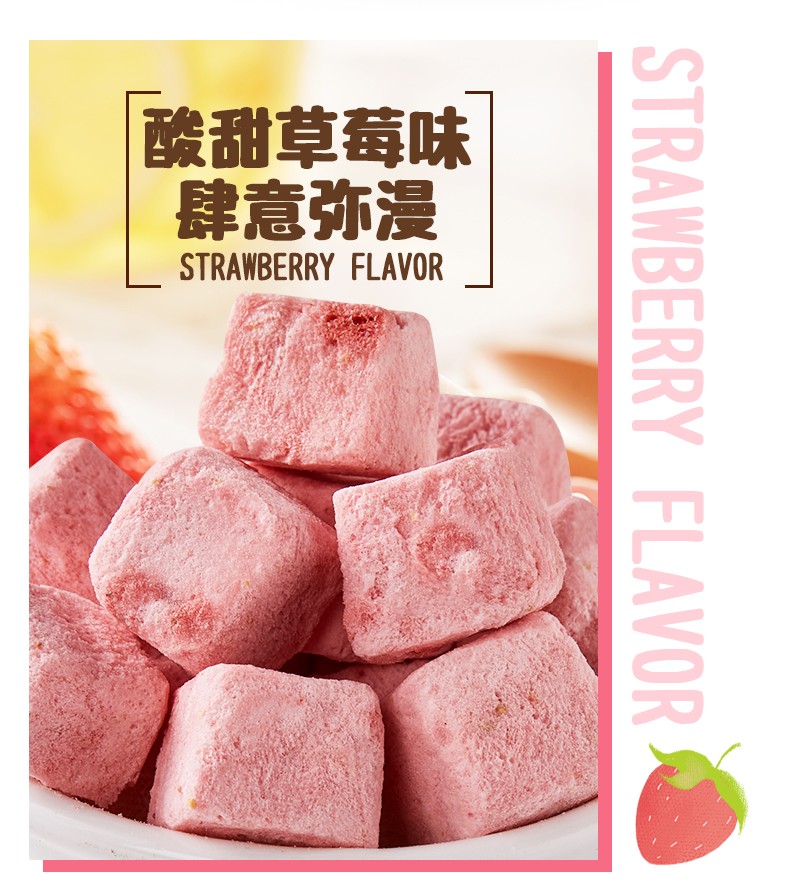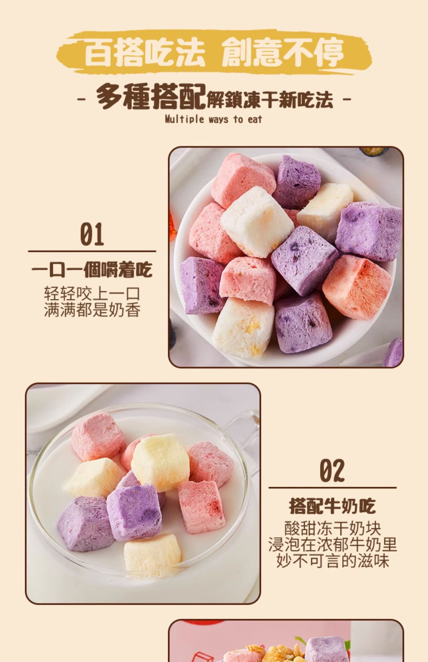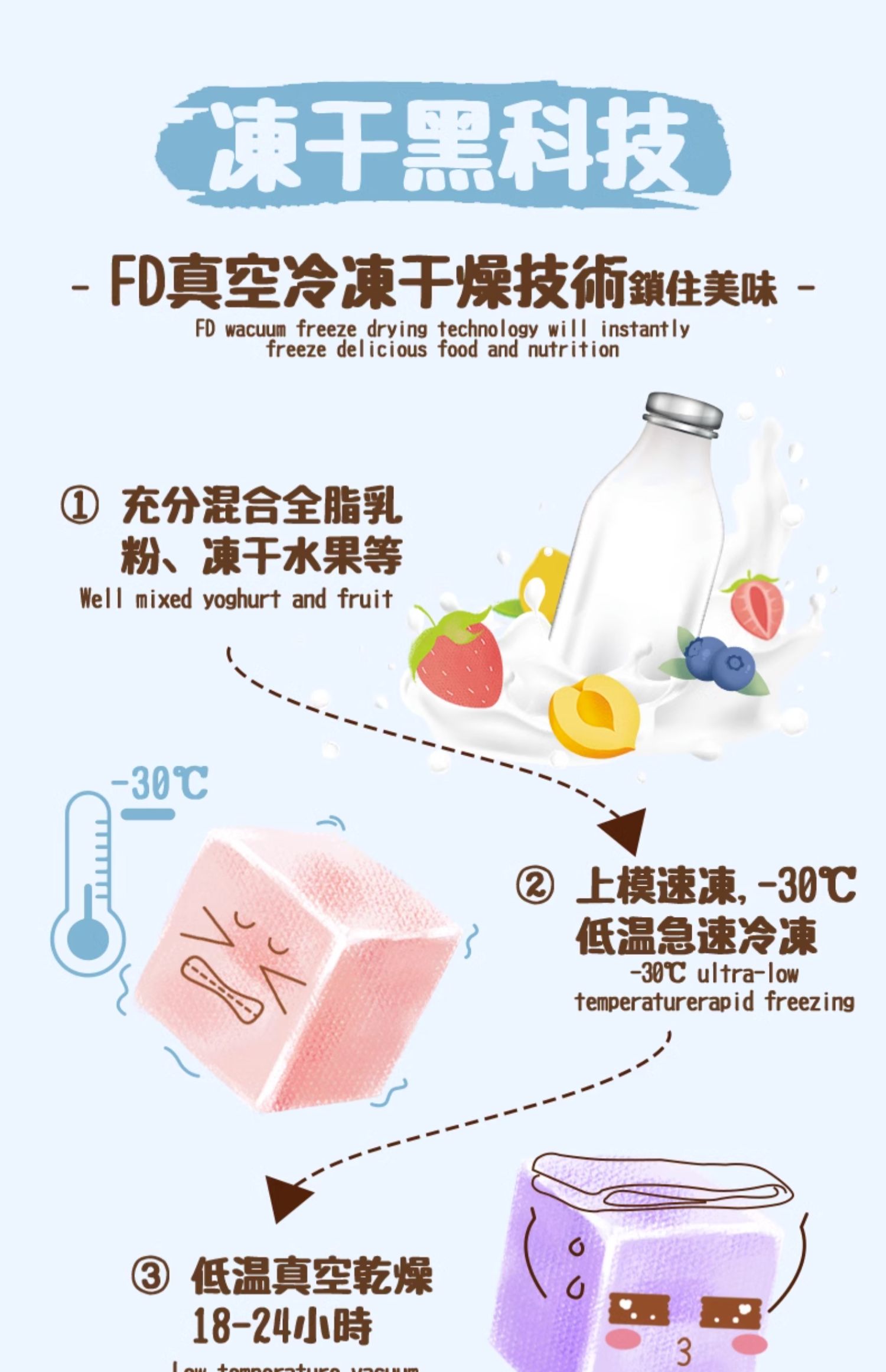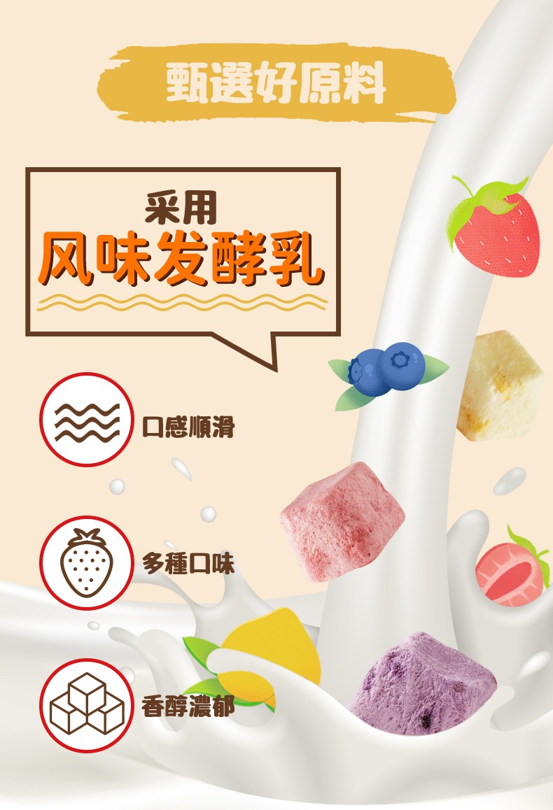 凍干酸奶塊,搭配牛奶更加美味。甄送好原料,采用風(fēng)味發(fā)酵乳,口感順滑,香醇濮郁。凍干黑科技,F(xiàn)D真空冷演干燥技布鎮(zhèn)住美味 -酸甜藍(lán)莓味橫舌尖!